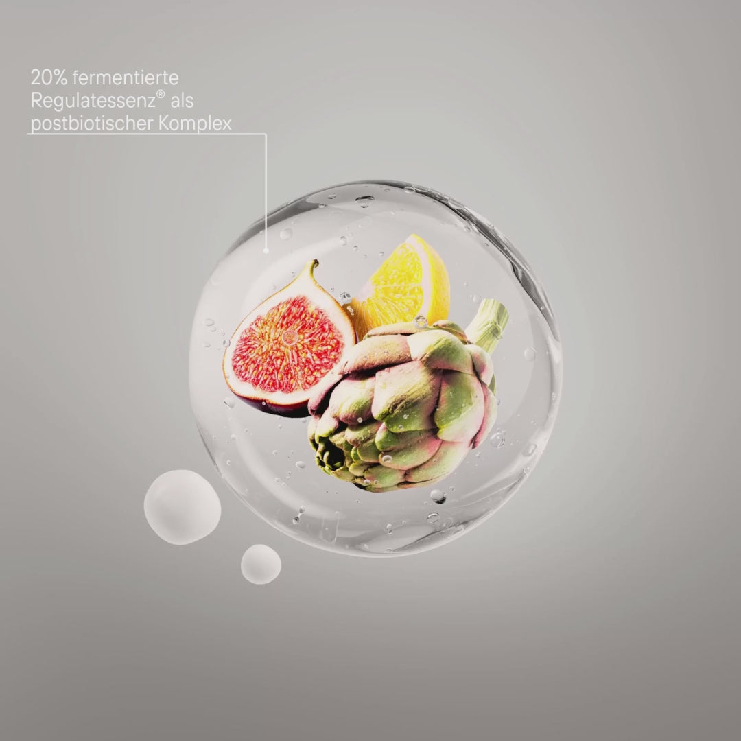 20% fermentierte Regulatessenz® als postbiotischer Komplex: Herzstück der Formulierung, der die Hautbarriere stärkt und das natürliche Gleichgewicht der Haut unterstützt. Die Haut fühlt sich widerstandsfähiger, harmonisierter und spürbar regeneriert an.